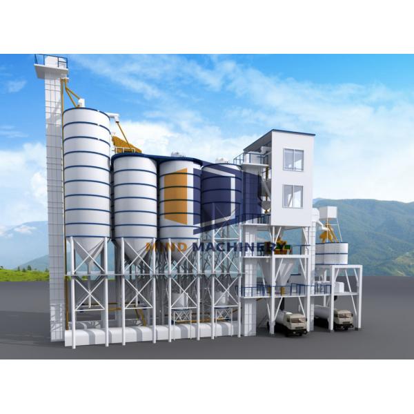 Automatic dry mix mortar plant is consist of storage bin, double shaft paddle mixer, outdoor bucket elevator, pre-mix hopper, additive hopper, end product hopper, packing machine, indoor bucket elevator, pulse dust collector, automatic batching machine, steel frame, etc.The storage bin is used to storage raw material, such as: cement, fly ash, sand and other material, its capacity is 60 m³and the quantity is 3 in general.